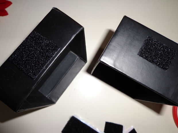 Necesita para luego cortar dos piezas del lado liso suave del velcro y pegarla a la caja como se muestra a continuación.