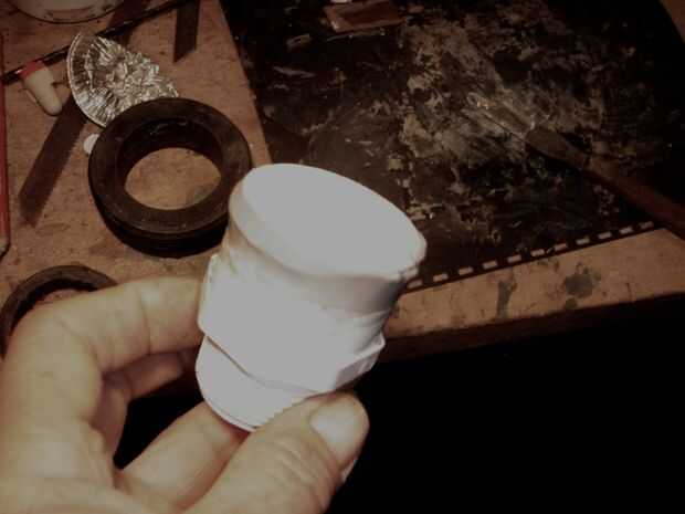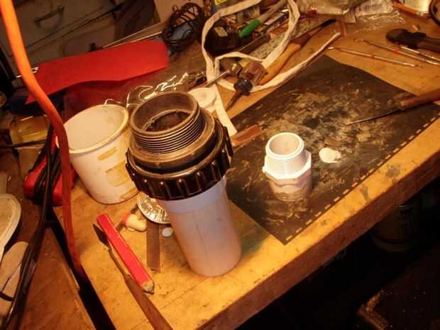 Cortar los peldaños de una Unión de 2", y sucedió que un 1 1/4" adaptador macho (hilo de rosca del resbalón X) encajan bastante bien en el final de la Unión. Corte los hilos de rosca de la Unión y raspado cualquier flash.
