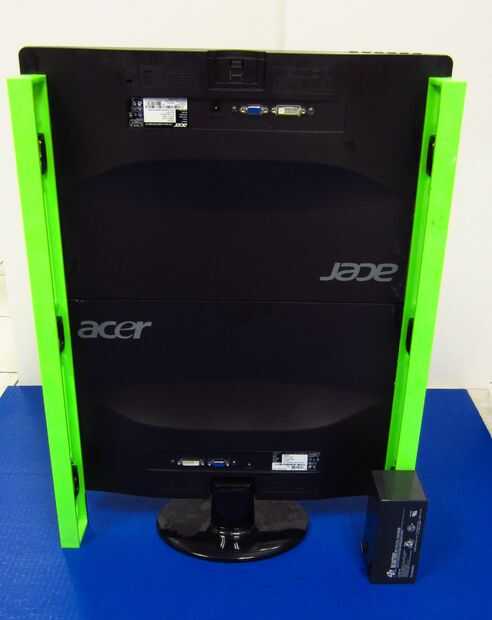 -Una vieja batería de una UPS que dejó de funcionar se pega a una regla que evita que al monitor superior se vuelque hacia adelante o hacia atrás.  Si usted tiene 2 pilas, sería más estable.