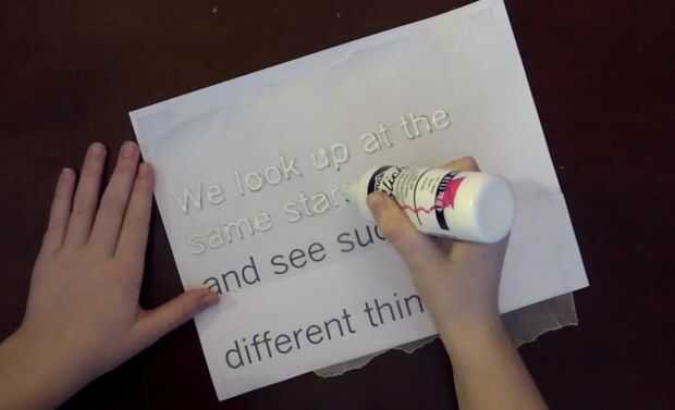 Luego coloque el papel encerado encima de la cotización y cinta adhesiva a la página para no deslizarse. Ahora traza las Letras con el pegamento de tela sobre el papel de cera. El más grueso los haces más fácil será de pelar al final.