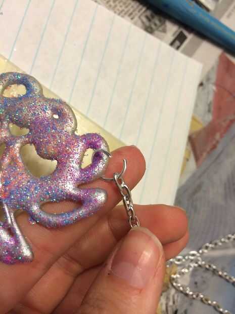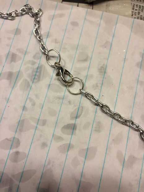 Abrir su tercer anillo del salto y ponerlo en el extremo de una cadena y abrir su cuarto anillo del salto y puso en el extremo de la otra cadena.