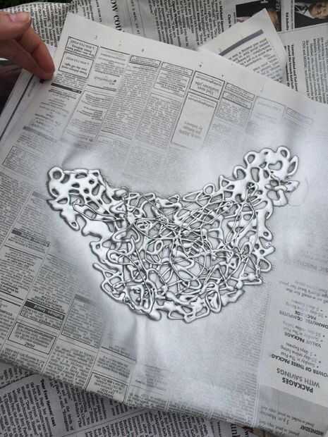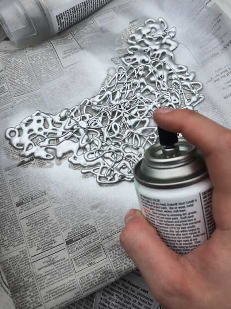 Salir al exterior y pintura de aerosol la forma de su cola caliente. Roció plata!