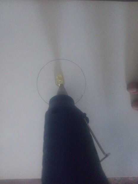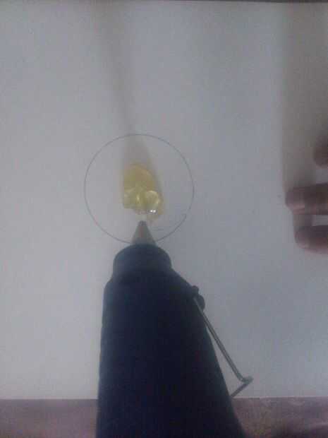 A partir del centro, aplique el pegamento caliente. No se preocupe si el pegamento caliente se ve desordenado u obtiene acumulado, pronto será plana. También es una buena idea para hacer un esquema del círculo usando pegamento caliente, después aplique el pegamento dentro.