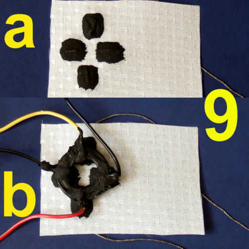 Para la toma de corriente (ver foto 9), coser el hilo conductor en un bucle para cada contacto y luego cubrirla con mix #4. Coloque algo plano y no pegajoso como silicio masilla vidrio revestido en la parte superior los contactos como se secan para crear una superficie plana. Después de que hayan secado, cubra la parte posterior con mix #6, pegamento ferromagnético.