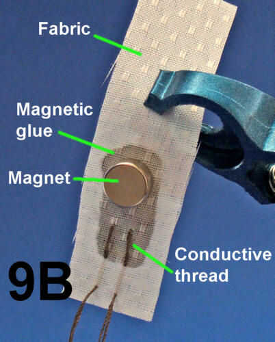 Foto 9B muestra un interruptor simple utilizando un imán de neodimio niquelado. Primero se debe coser dos contactos separados con doble hilo conductor. Luego cubrir la parte posterior con pegamento magnético dejando suficiente espacio por encima de los contactos de muelle el imán limpiador. Para activarlo simplemente deslice el imán sobre los contactos de dos hilos. La hice tenía una resistencia de aproximadamente 1,16 ohmios con un imán de 3/16 "x 3/8". Con un imán más delgado de 1/16 "x 1/4" tenía una resistencia de aproximadamente 1,63 ohms cuando en.