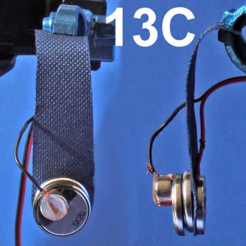 Cuando el volumen del soporte de la batería no es crítico, imanes trabajan bien para crear un soporte incluso en un circuito de tela. Baterías, contactos y la tela se celebran entre dos imanes. En Pic13C se puede ver cómo líquida cinta aislante se utilizó para crear una posición de atraque para el imán limpiador más pequeño. Simplemente se ha deslizado en la batería para encender el poder. El limpiaparabrisas fue envuelto y torcido con alambre calibre 22 trenzado y luego pegado en la parte superior para mantenerlo en su lugar. Para alambre trenzado muy flexible me gusta usar cable de servo.