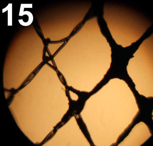 He cubierto con éxito material de jean de algodón, neopreno, nylon y poliéster. Usando el método anterior, puede incluso cubrir a tela de red de nylon o poliéster que resulta en una tela casi transparente. Ver pic14. Foto 15 muestra las 20 plazas por pulgada de tela con un aumento de 50 x. Se puede ver que la capa conductora resultante es bastante delgada.