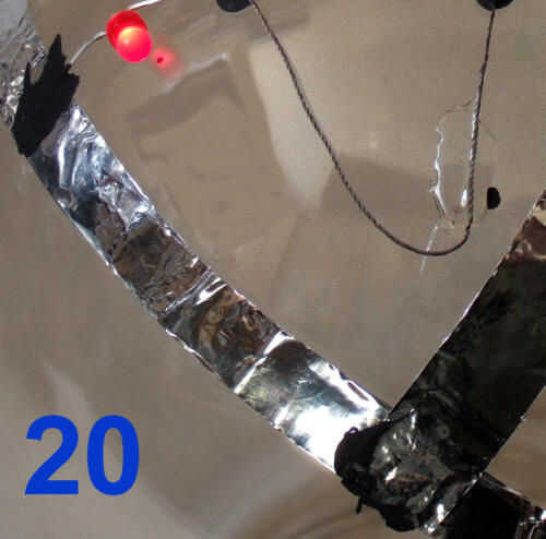 Usted puede hacer una cinta más conductor de aluminio regular (ver foto 20). Por ejemplo, si usted quiere transmitir baja potencia DC a través de una pared, puede cortar la lámina de aproximadamente 1/2" de ancho y pegar con cemento de contacto del Dap o Goop. Cuando usted necesita para unir dos tiras para carreras largas o a las esquinas, puede usar mezcla del pegamento conductor #1. Mientras que 1/2" ancho de aluminio tiene una resistencia de aproximadamente.1 ohmios por pie, empalmes pegados 1" largo y 1/2" ancho tienden a tener una resistencia de 3 a 4 ohms. Luego puede utilizar la misma mezcla para pegar LEDs u otros componentes a la hoja. Si pintan sobre el con una buena pintura de látex, usted puede hacer la mayor parte del circuito casi invisible.