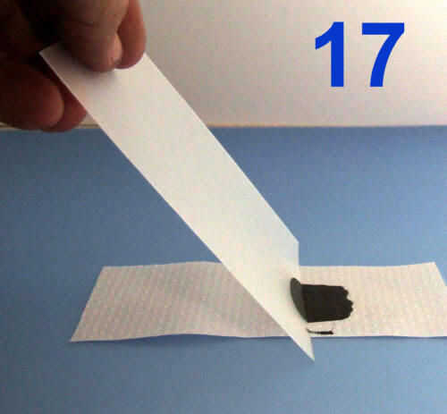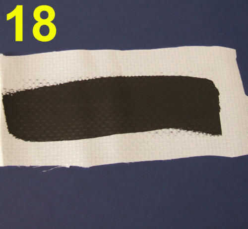 Usted puede hacer varias telas conductoras cubriendo con el método de la espátula. Simplemente tome la mezcla del pegamento conductor #4 y extenderlo finas e incluso en la superficie usando una tarjeta de crédito de plástico o espátula de metal (Foto 17). Foto 18 muestra al resultante entelado que luego se puede cortar a tamaño. Para resistencia mínima normalmente se lleva una segunda capa cuando la primera se haya secado. La resistencia es generalmente alrededor de 300 a 1.000 ohmios por pulgada. Esto es demasiado alto para la transmisión de potencia más baja, pero puede ser útil para el envío de señales a través de juntas flexibles o para la fabricación de interruptores y sensores. También puede tener posibilidades de alto voltaje. No he tenido tiempo para probarlo, pero puede ser posible este tipo de tela conductora de la placa de cobre o níquel y disminuir dramáticamente la resistencia. Foto 16 muestra la flexibilidad de la tela conductiva resultante.
