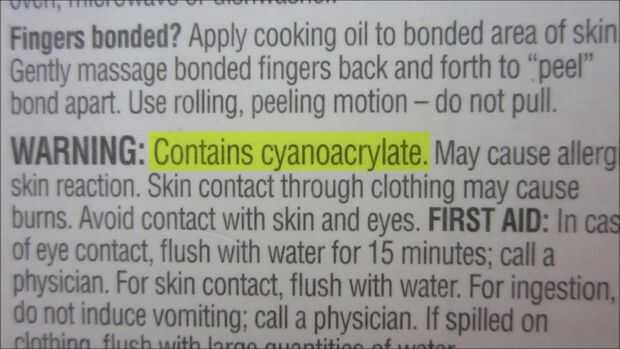 2. pegamento adhiere a la piel rápidamente y fácilmente puede pegarse a los dedos juntos. Si esto sucede puede ablandar el pegamento con un solvente como acetona (quitaesmalte).