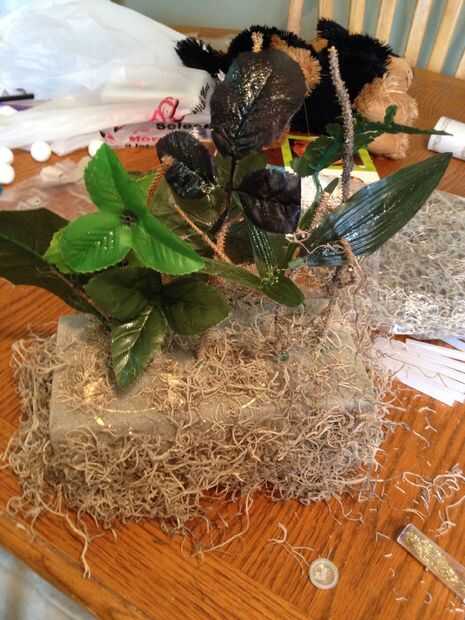 Quinto: pegamento en hojas con pegamento de carpintero o pegamento caliente. (puede que desee poner algunos musgos en la parte superior para la cobertura).