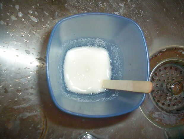 Mezclar 4 cucharadas de leche 2 cucharadas de vinagre o una proporción de 2:1 de leche en vinagre. Mezcla con la paleta se pega de unos minutos o hasta que queden pequeños grumos cuando usted saca la paleta.