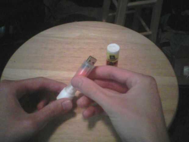 Bueno, más o menos se hace en este momento (una vez que el JB weld ha secado y curado totalmente). A juntar las piezas y probar. Gire la parte inferior, como lo haría con un palo de pegamento normal, para extender y retraer el dongle