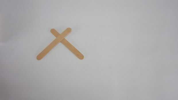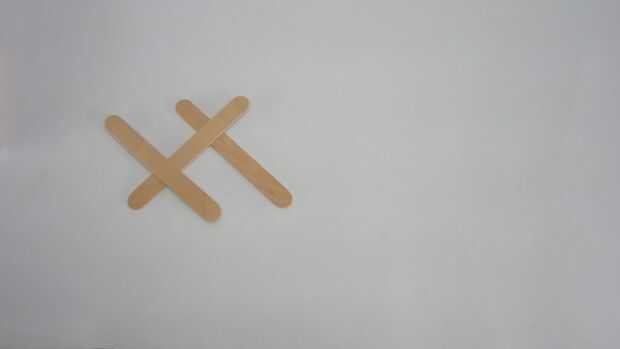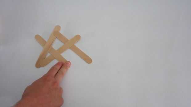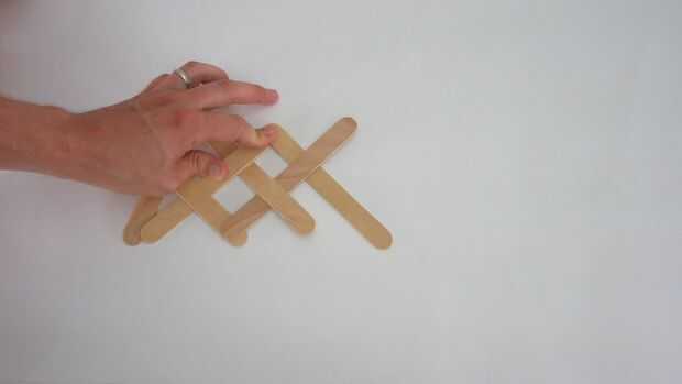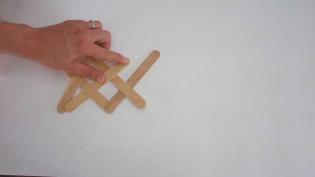 Para hacerlo, comience colocando un palillo en la tierra en un ángulo de 45 grados. Coloque un segundo palillo en la parte superior de modo que los palillos son perpendiculares y se cruzan en el tercio superior de cada palo. Entonces lugar un tercer palillo encima de la segunda para que se cruzan en la parte inferior tercera de los dos palos. Para bloquear el extremo izquierdo en su lugar, tome un cuarto palo y tejer en el extremo superior del primer palo, en medio de la palanca de tercer y en el extremo inferior de la tercera.