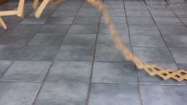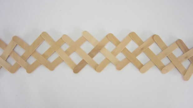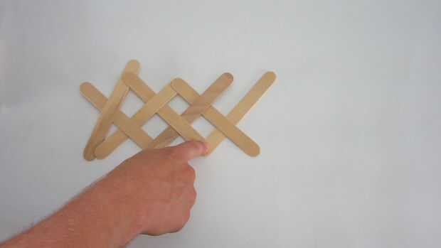 Ahora solo seguir el patrón hacia fuera en el lado derecho. El palo siguiente debe ir sobre el extremo del palillo de la tercera y en el primer palillo. Repita este proceso hasta que la cadena llegue a la longitud deseada. Los palillos deben intersectarse en los extremos o el punto de 1/3 en el palo. Para bloquear el final de la cadena, inserte una última enfermos entre las tres piezas. Alternativamente, sólo se podría colocar un objeto pesado encima de los pedazos de extremo. Este tejido puede ser curvado fácilmente doblando cuidadosamente una sección recta de la cadena. Para detonar la cadena, simplemente saque la última pieza que ha agregado. La cadena debe levantar de la tierra y viaja como una onda hasta que todas las piezas fueron separadas.