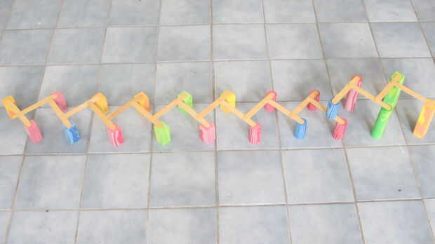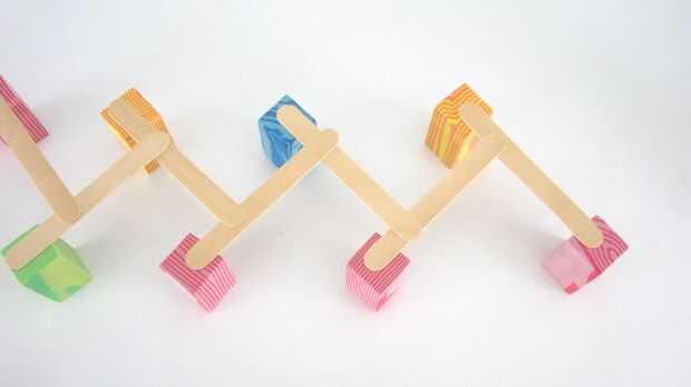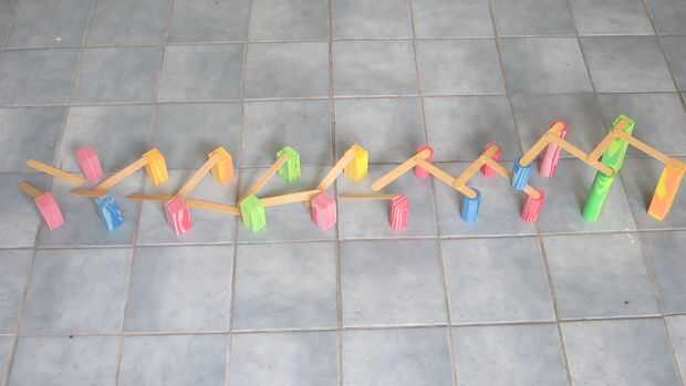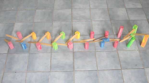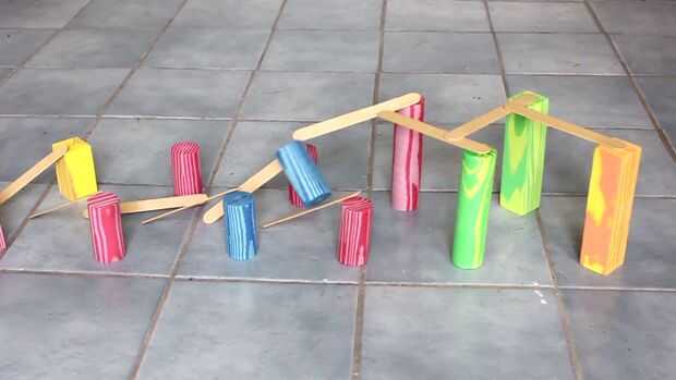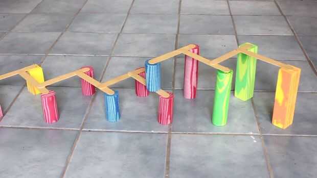 Las bombas de reacción en cadena en los pasos anteriores detonan muy rápidamente (hasta 100 pies por segundo/30 metros por segundo). Esto es muy impresionante pero la acción es muy rápida. Si quieres una pantalla más duradera, otra opción es la configuración de la raspa de arenque. En esta configuración, palos se apilan para que soportan el peso de la palanca al lado de ellos. Cuando se quita el soporte, los palillos simplemente caen al suelo en serie como una cadena de dominó.