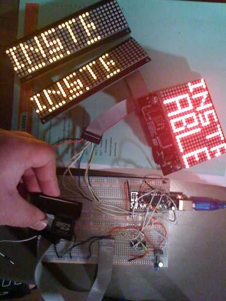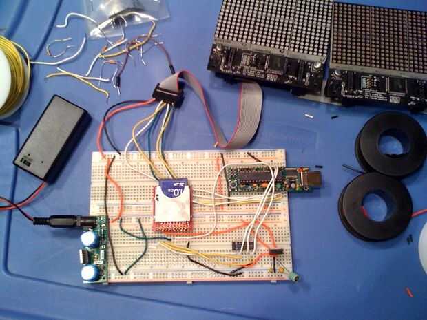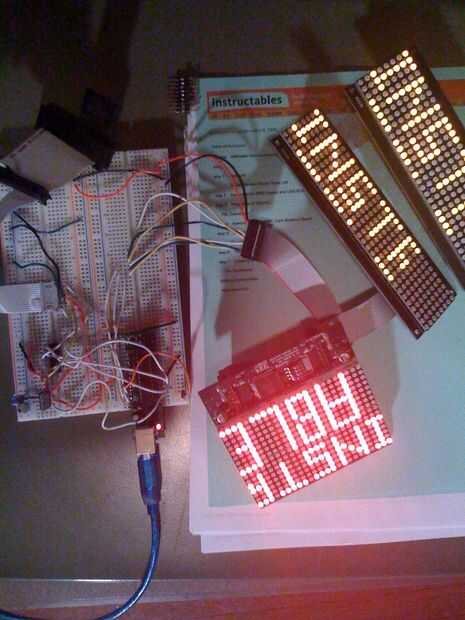 Con respecto a la fuente de alimentación de 9 voltios: una batería de 9 voltios funcionará, pero tendrá problemas extraños cuando comienza a disminuir. Una vez que el voltaje de la batería (cuando está probado en un metro) cae por debajo de 7 voltios, que la pantalla puede enciende bien, pero allí será suficiente corriente para alimentar el Arduino y el comportamiento es algo impredecible. Una de 9 voltios - fuente funciona muy bien, y el LM7805 en el BBB debe ser capaz de manejar una entrada de 12 voltios, como eso de un adaptador de auto. (Uso depor favor PRECAUCIÓN aunque si pones esto en un vehículo en movimiento! Solo eres responsable de lo que sucede si usted distrae a otros conductores! Incluso puede considerar cableado por un acelerómetro y desactivar la pantalla cuando la unidad esté en movimiento. El circuito es suya la responsabilidad. Lo recomiendo para una ventana o escritorio, o tienda de ventana, no un vehículo en movimiento! Me encanta la idea de él como una pegatina para el parachoques, pero no a riesgo de vida o la salud de nadie! En general sin embargo esto debe ser mucho menos distracción que más carretera señales digitales, y muchos impresión pegatinas para el parachoques con duro leer texto)