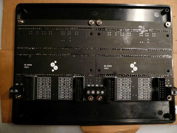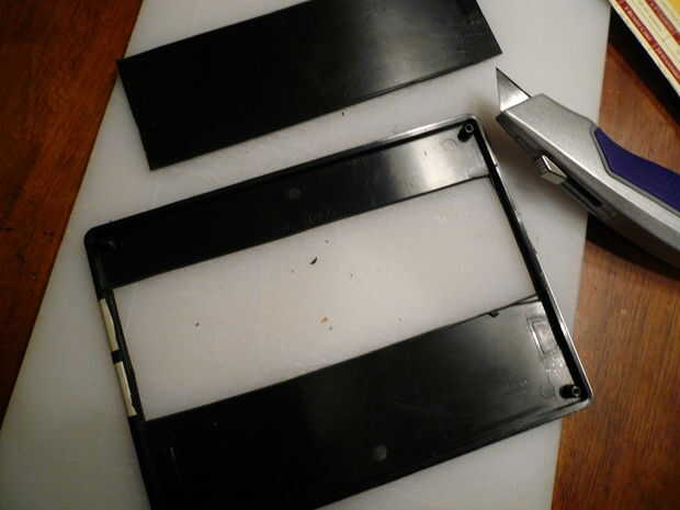 La tapa de la caja se utiliza para unir las pantallas LED. Para ello, necesitan cortar en su totalidad en la tapa exactamente la longitud y anchura de los dos muestra juntos. Yo corte una caja de cartón exactamente el tamaño de las dos pantallas de LED, sin contar con la tarjeta de circuitos que se montan, o los otros componentes en el tablero, el tamaño de los cubos LED. Entonces coloca esto en el interior de la tapa y pegadas en su lugar con cinta adhesiva. Usé un cuchillo de la caja para anotar varias veces la tapa a lo largo de los lados de la cartulina hasta que la corte era completo. Poco de afeitado seguimiento con el cuchillo de la caja siempre una empresa agradable apropiado para las pantallas de LED, con el resto de la Junta tras el plástico.