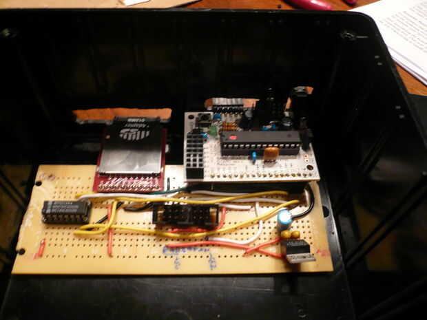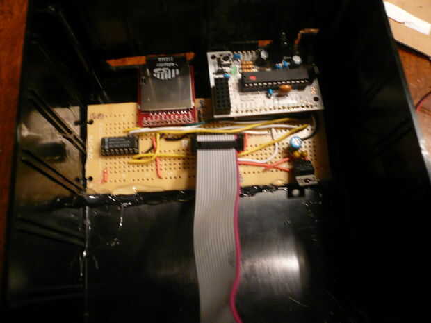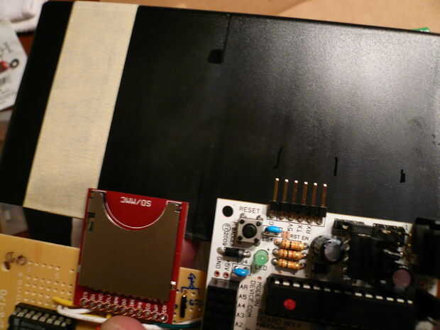 Colocar las placas dentro de la parte inferior de la caja, alineada el DC jack y el zócalo de la tarjeta SD justo donde pensé sería contrario accesible y luego usa una pistola de pegamento caliente para pegar el tablero al fondo de la caja. También he añadido algunos pegamento caliente alrededor de la toma de CC para mantener la presión en el receptáculo de la cabecera al insertar al conector. Coloqué una pequeña cantidad de pegamento caliente en la parte inferior del PCB antes de colocarlo en el recinto y rápidamente Coloque en su lugar. Yo entonces alineado todo el filo de la PCB con pegamento caliente, otra vez, para mantener firmemente en su lugar antes de conectar el DC jack o tarjetas SD.