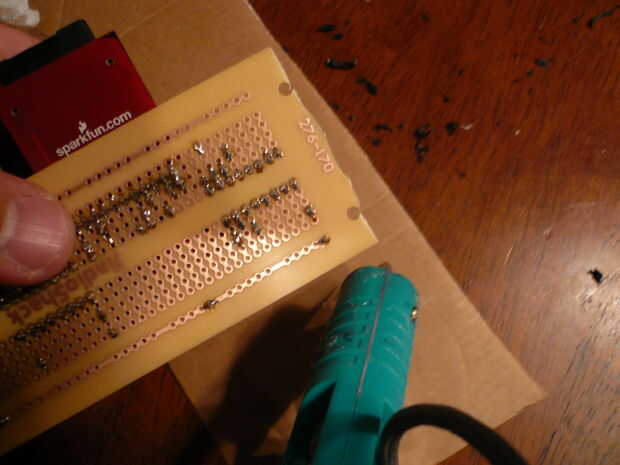 Empezar marcando cada extremo del tablero del circuito impreso de Radio Shack (lejos de cualquier rastro de cobre) y utilizar un par de pinzas para romper el lado innecesario. Cuando haya terminado, la Junta debe ajustarse longitudinalmente contra el lado de 6 pulgadas de la caja.