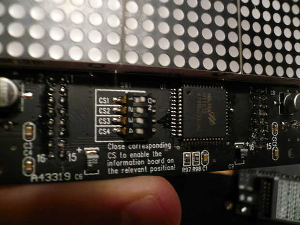 Cada uno de los tableros de pantalla tiene un DIP-switch que controla si o no la Junta responde a CS1, CS2, CS3 o CS4. Asegúrese de que el tablero en el lado izquierdo de la pantalla (cuando es hacia fuera) tiene CS1 encendido, y todos los demás se apaga. Asegúrese de que el tablero de derecha tiene CS2 activado, con todos los interruptores apagados.
