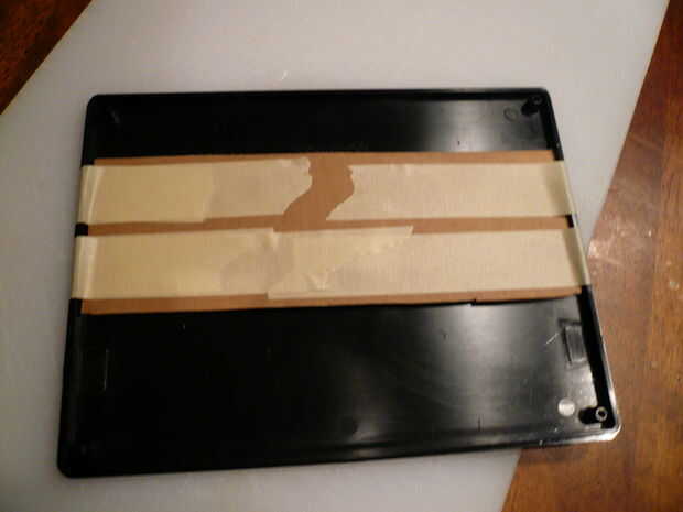 Ahora utilice algún método ingenioso (yo usé cinta de enmascarar para marcar áreas aproximadas) para hacer ranuras en el lado de la caja donde se encontrará lo siguiente: