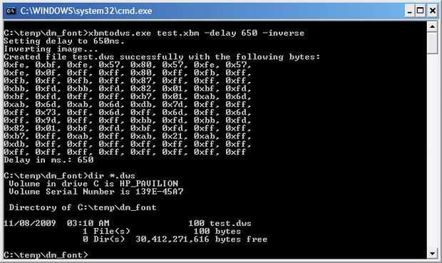 xbmtodws crea un archivo de .dws de 100 bytes de cada archivo de .xbm 16 por 48 píxeles. 96 bytes son datos de píxeles, y 4 bytes contienen para que aparezca la imagen en milisegundos.