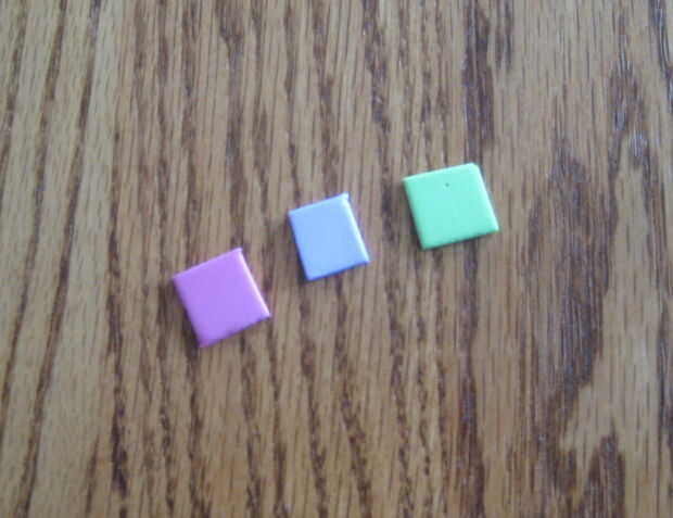 Cortar 9 cuadrados de cada color. Asegúrese de que encajan en el cubo sin afectar a la rotación de los cubos. Puede utilizar la regla para hacer cuadrados perfectos pero he encontrado esto casi imposible y demasiado desperdiciador de tiempo así que solo de ojos apretados les.