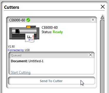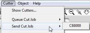 Haga clic en herramienta de corte > Enviar corte trabajo > CE6000. Se abrirá el menú de "Cortadores" en el lado derecho de la pantalla. Haga clic en "Enviar a la corte".