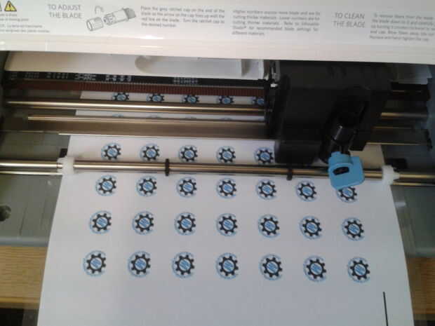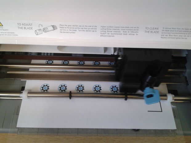 Asegúrese de que los ajustes y la trinquete correctamente configurados para los medios de comunicación de la etiqueta engomada. Nuestro objetivo es 'kiss cut', que es, el nivel superior de la etiqueta sin cortar el papel del forro. En nuestra máquina esto significa reducir la hoja de trinquete ajuste por uno, a continuación, reduciendo aún más el ajuste de espesor, pero cada máquina de la silueta es diferente, y por supuesto también depende de cómo sharp es la hoja!