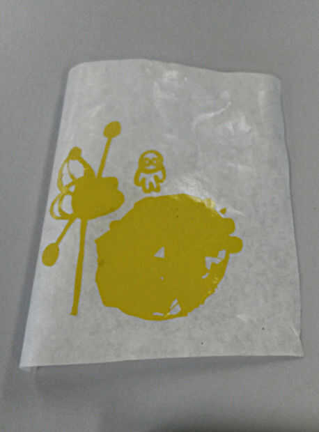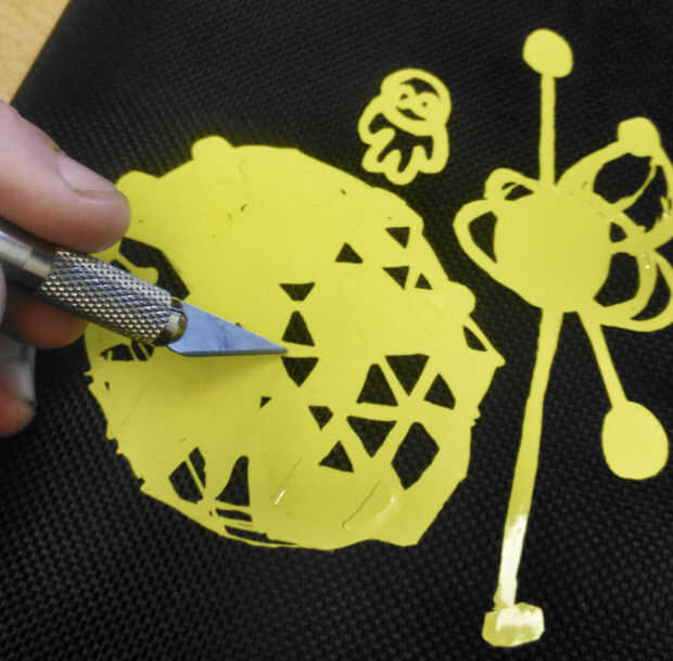 Luego Pelar cuidadosamente la sola hoja pegajosa echada a un lado del corte de vinilo. La corte parte del vinilo con el gráfico, debe despegarse la con sola cara papel pegajoso. Si las partes no se despegue, puede inducir a presionando esa zona otra vez y peeling en una dirección diferente.