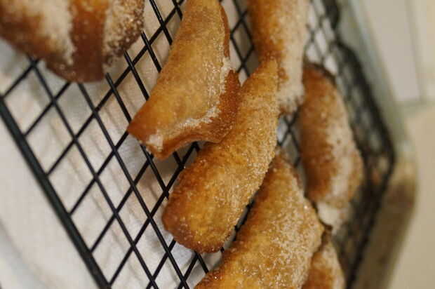El aceite debe ser caliente por ahora, pero espero que no demasiado caliente!  Sólo usé aceite vegetal porque es lo que tenia en mano fin de utilizar lo que quieras, como sabes que el sabor sea compatible.  No tarda largo así que mantenga un ojo en las etiquetas de la olla, necesitan ser entregados parcialmente a través de y entonces trazado sobre una rejilla para enfriar.  Pongo una toalla de papel debajo de la parrilla para recoger goteos.  No los Coloque directamente sobre la toalla de papel porque se le pegan.