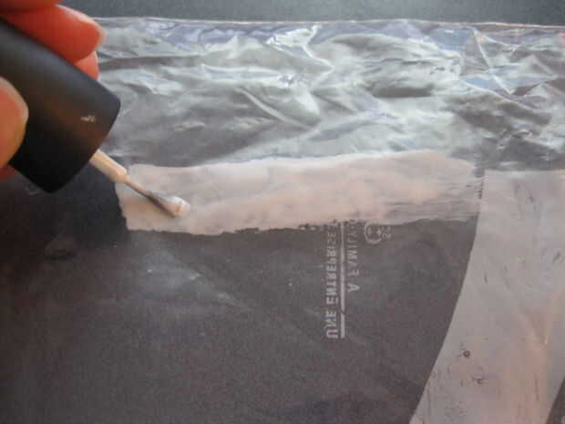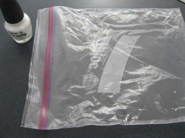 Obtener una bolsa de Ziplock o cualquier superficie plastic-ish como una bolsa de basura o una bolsa de mandado. Con un pálido (yo usé uno blanco nacarado de Forever21) esmalte de uñas y pintar una franja sobre la longitud de su palma y tan grueso como su miniatura. Déjelo secar.