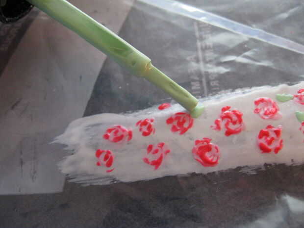 Ahora uso un esmalte de uñas verde pálido y dab en las rosas, moviéndose lejos del centro de la flor como los rayos emanan del sol. Me inclinaría por no más de 2 hojas por capullo de rosa.