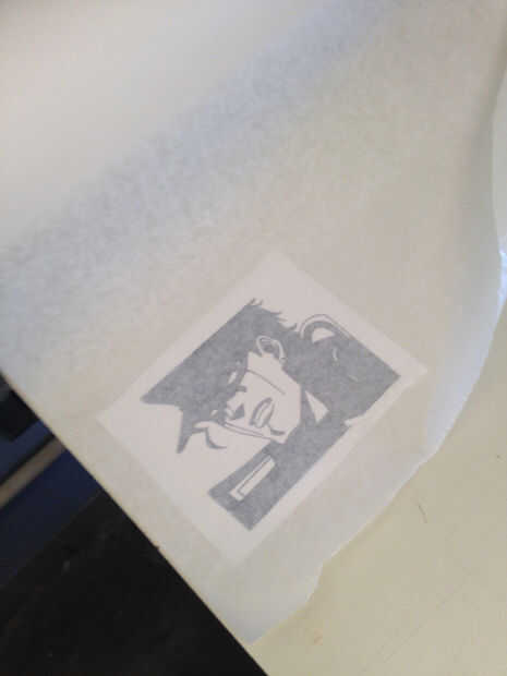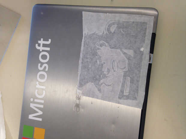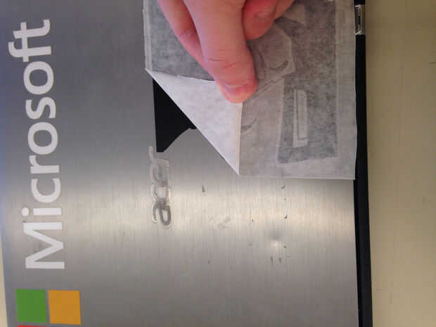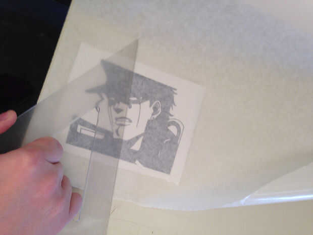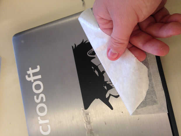 Después de que Lisa la etiqueta hacia fuera, retire la cinta de la transferencia. Hacer este paso muy slooooooooowly. (Imagen de 4/5) Cuanto más rápido vayas, menos probable es que el vinilo se pega y bien.