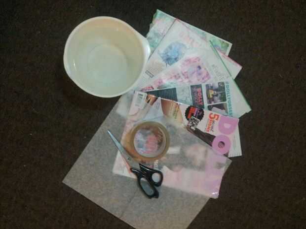 -algunos caliente agua en un recipiente -tijeras -claro contacto o cinta de papel de embalaje -recortes de revista papel de la hornada-(optional) -una moneda