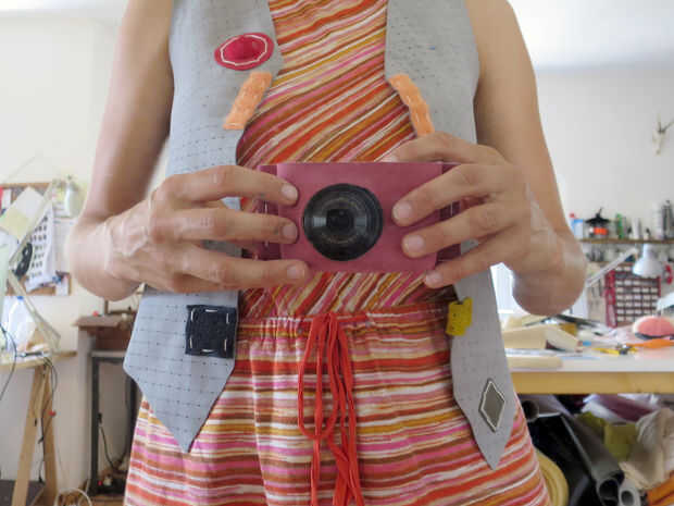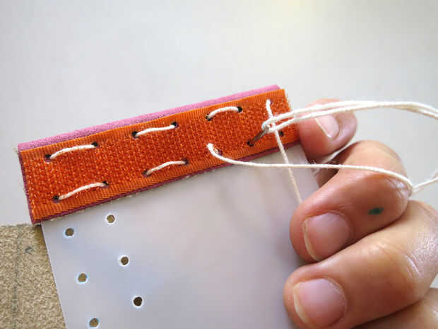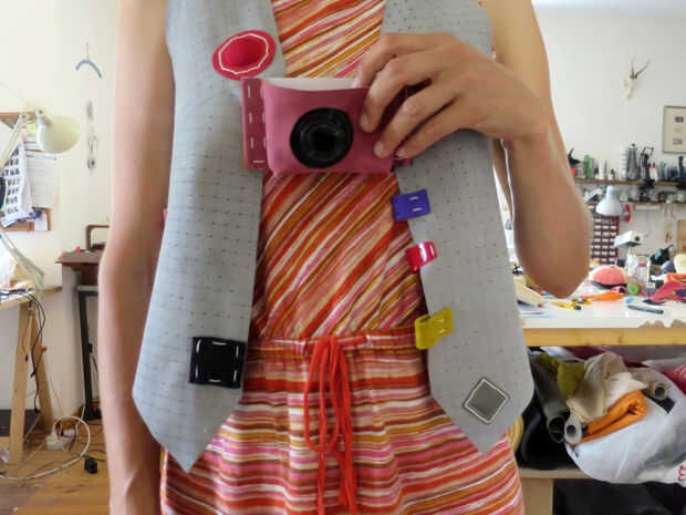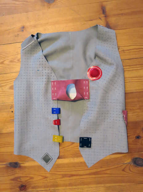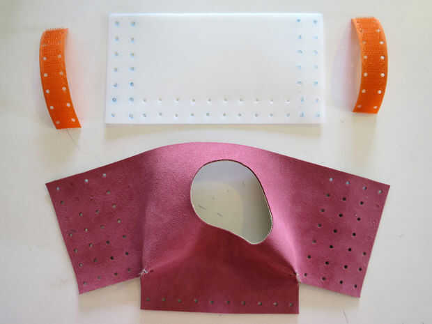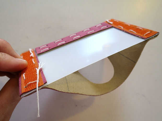 Este es un primer intento de tratar de hacer un soporte de cámara montada por el chaleco que me permitiera tomar fotos de mi trabajo como estoy haciéndolo. Una lámina de plástico rígido con agujeros perforados a lo largo de los lados se utiliza para mantener la bolsa rígida.