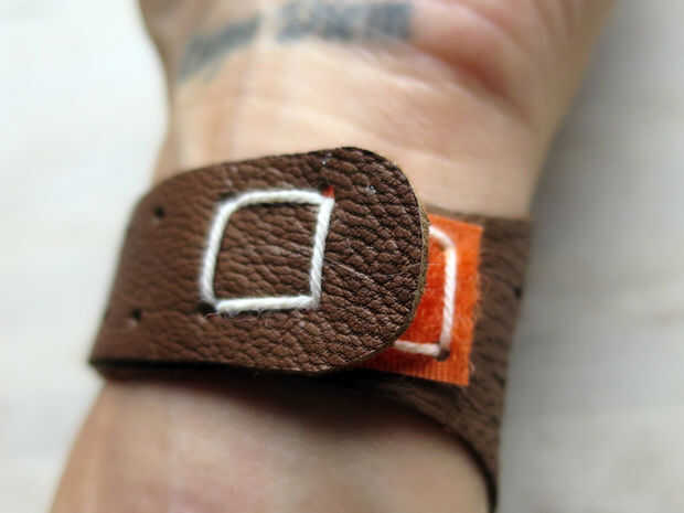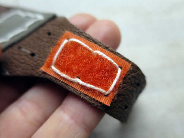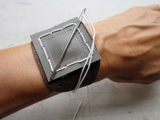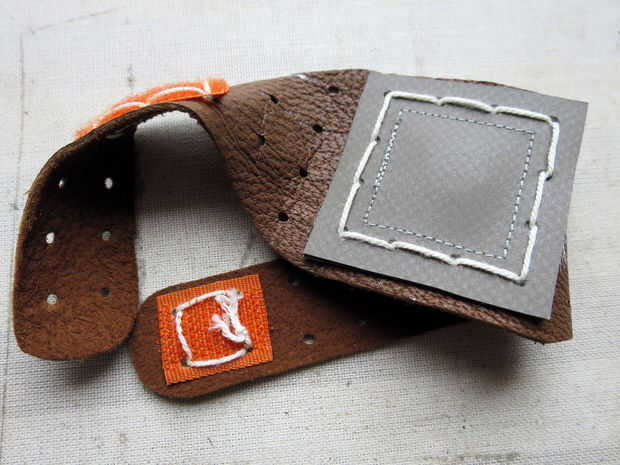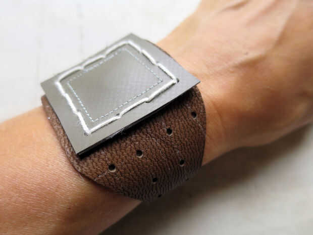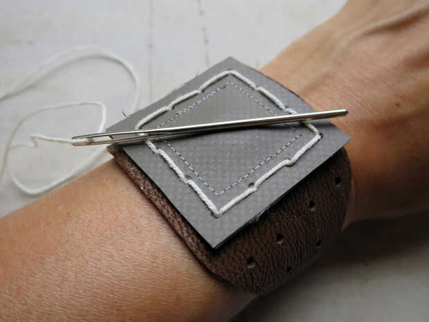Este último ejemplo es de una pulsera hecha de tejido perforado para que muchos de los elementos que acabamos de describir podrían ser Unidos a su muñeca. Este ejemplo en particular muestra un imán envuelto en alguna lona recubierto de vinilo cosido a la pulsera convirtiéndose en una gran herramienta para almacenar pasadores u otras cosas magnéticos de peso ligero.