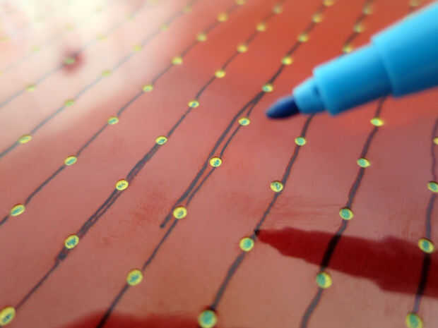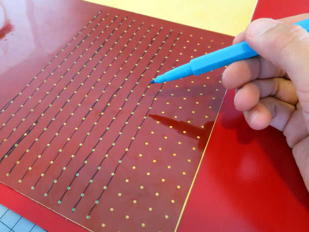 Este proyecto consiste en hacer un montón de agujeros! Si usted está haciendo estos a mano, te resultará muy útil contar con una plantilla de cuadrícula de agujero. Escogí crear mi red como una cuadrícula de 1 cm x 1 cm y sobre todo hacer 2mm diámetro. Para hacer mi plantilla he creado un archivo de corte en Illustrator (ver adjunto SVG) y vinylcut de una gruesa kapton película (porque era el material resistente sólo tenía a mano). Entonces yo puedo dibujar una línea sobre una fila de agujeros y la máquina dejará puntos sólo donde están los agujeros.