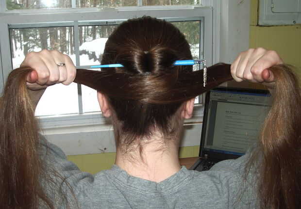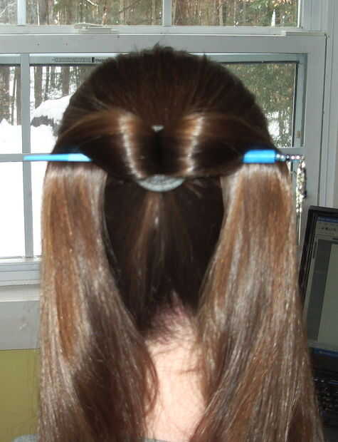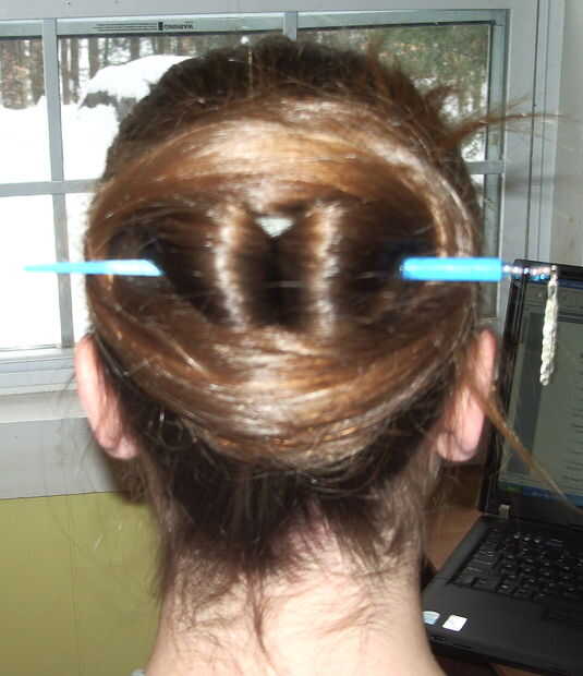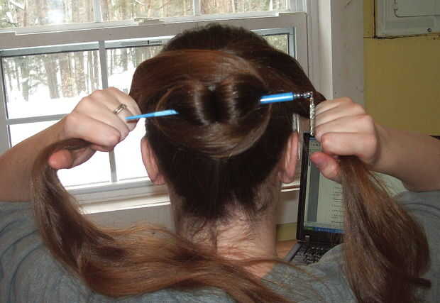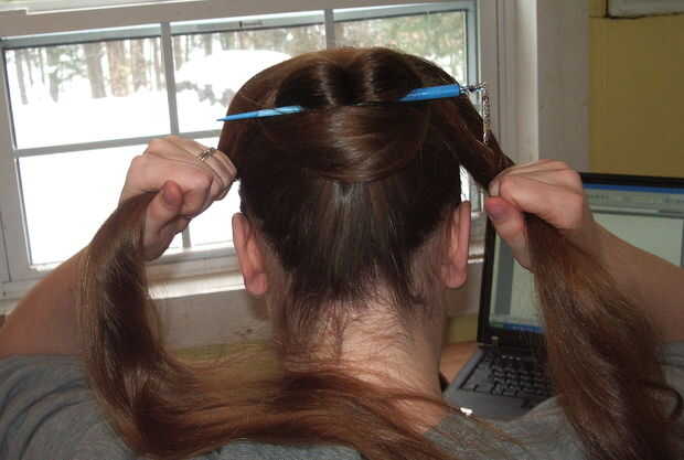 4. cada pieza en el lazo del pelo, detrás de palillo del pelo de viento. Meter los extremos en o con Horquillas/clips para el cabello.
