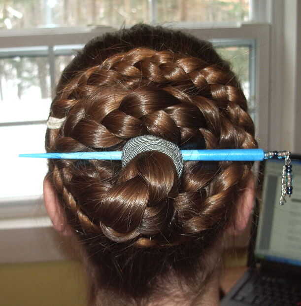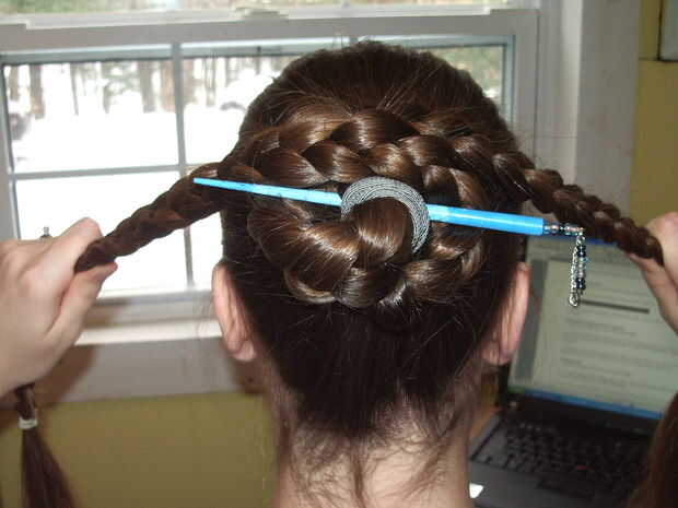 4. cada trenza alrededor de lazo del pelo, detrás de palillo del pelo de viento. Tuck en los extremos, o asegurar con Horquillas/clips para el cabello.