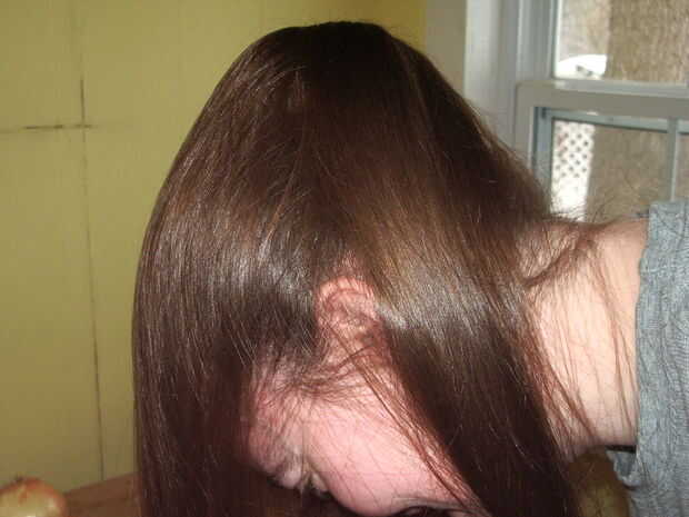 4. inclinarse; extensión pelo sobre el calcetín, cubriéndolo totalmente. Utilice otro sostenedor del ponytail para fijar cabello extendida sobre el calcetín.