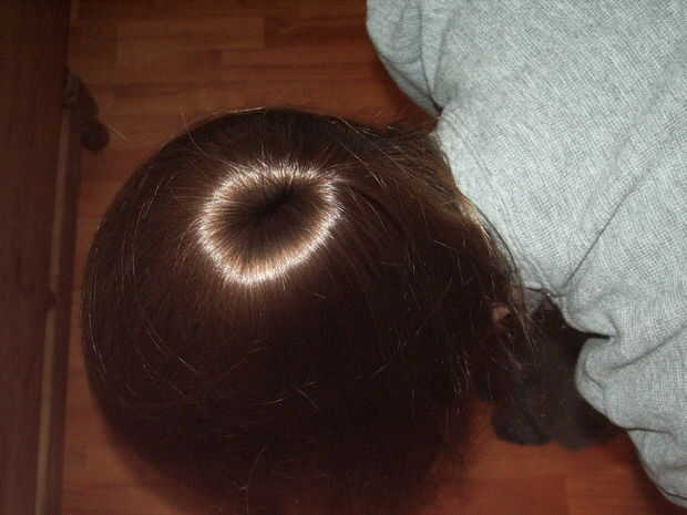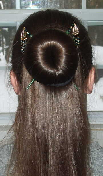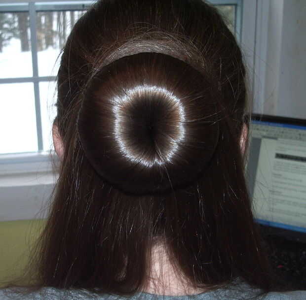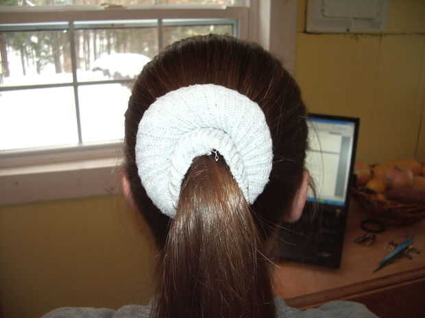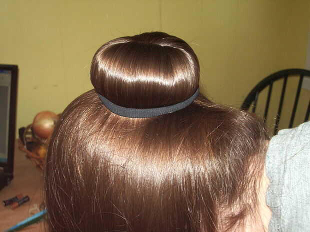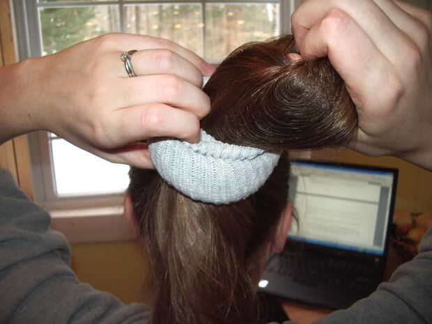 5. Párate derecho; suavemente empuje el pelo para que el resto (si tienes un resto) se extiende bajo el bollo calcetín recién creado. Hacer lo que queráis con esto; trenza y gire alrededor de bollo, simplemente gire alrededor de bollo, y deje que cuelgue. En cualquier momento, un palillo del pelo se puede utilizar para aumentar la estabilidad del moño o para la decoración.