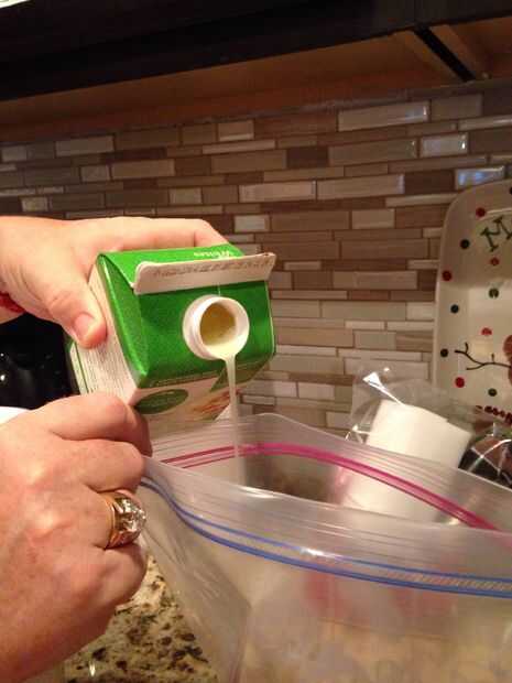 Now comes the fun part! Vierta en algunas claras de huevo, sello de la bolsa de galón y agite! Como se puede ver, pongo una parte muy importante en los casquillos. Esto es porque si se salta esto, el contenido de la bolsa va a volar por todas partes. Así, agitar con precaución!