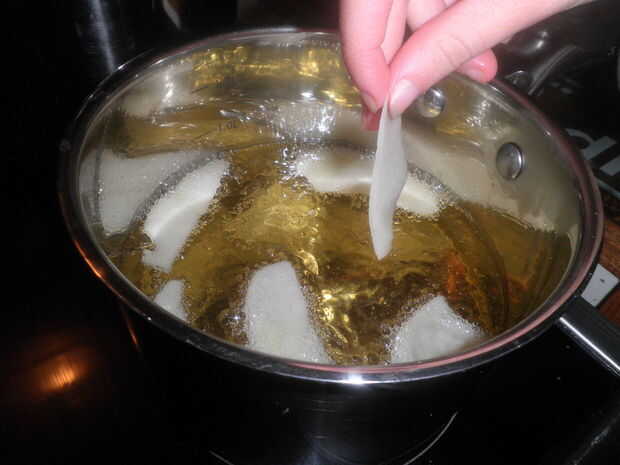 calentar el aceite hasta que caliente y agradable. para comprobar si el aceite está suficientemente caliente, deje caer un peeling y si al instante las burbujas alrededor de los bordes, entonces el aceite está listo.