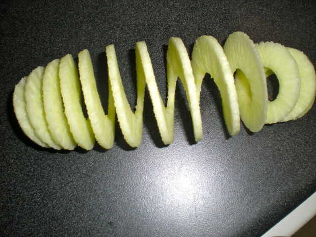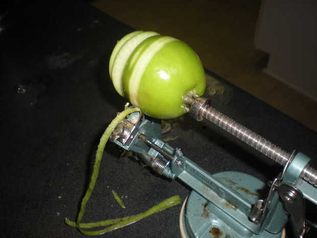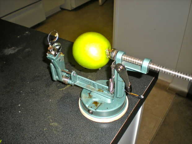 4. por la fuerza a aplicar un fondo de apple a los picos de la peladora por lo que el núcleo está en línea con las puntas (ver imagen 2)