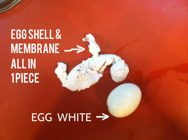 Después de agitar en la jarra de agua, la cáscara del huevo se rompe en cientos de trocitos y celebrada a la delgada membrana de goma que cubre la clara del huevo duro hervido. Simplemente pela apagado la membrana y la cáscara sale con él. Deje correr agua fría sobre huevo y manos evitará que le quema las manos.