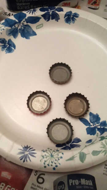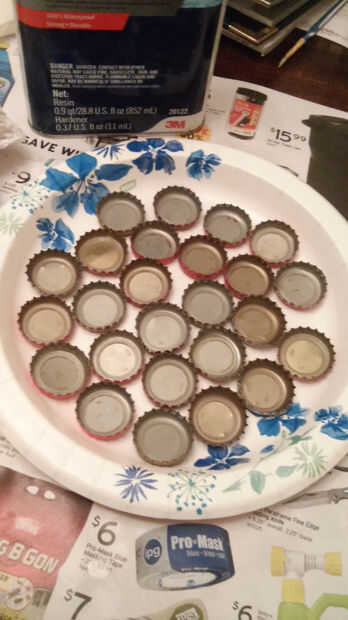 Empecé a arreglo de tapas de botellas en mi plato desechable que utilizaba como mi molde.
