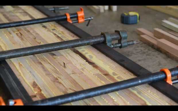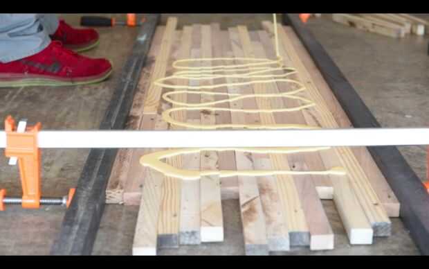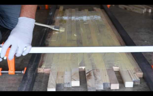 Ahora que tienes el el patrón de la madera. Ponga todos los tableros de abajo hacia atrás y pintan con pegamento. Para hacer esto un poco más fácil, puede sujetar ligeramente las juntas para dejar estable mientras que pinte en el pegamento.