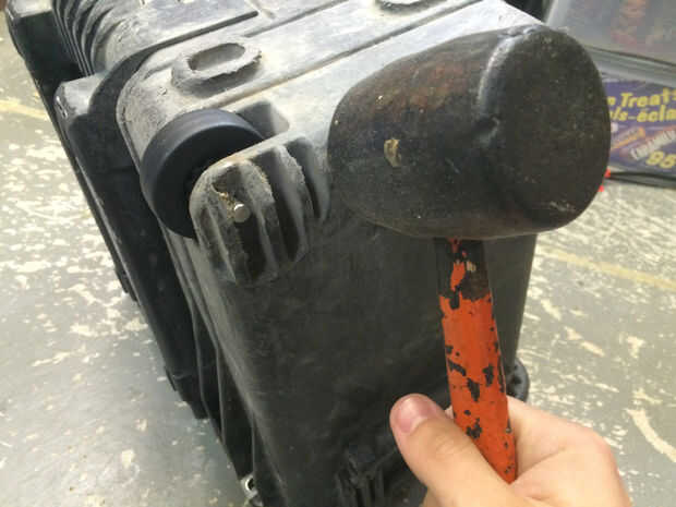 Use un mazo/martillo y cualquier cosa que no sea su dedo para empujar el eje hacia atrás con la rueda nueva. Usé un poco de taco de chatarra.